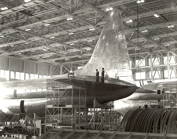 The tail section of the Constitution, an aircraft under construction at Lockheed Aircraft Co., Burbank, 1946. Harvey Christen collection. The Huntington Library, Art Collections, and Botanical Gardens.