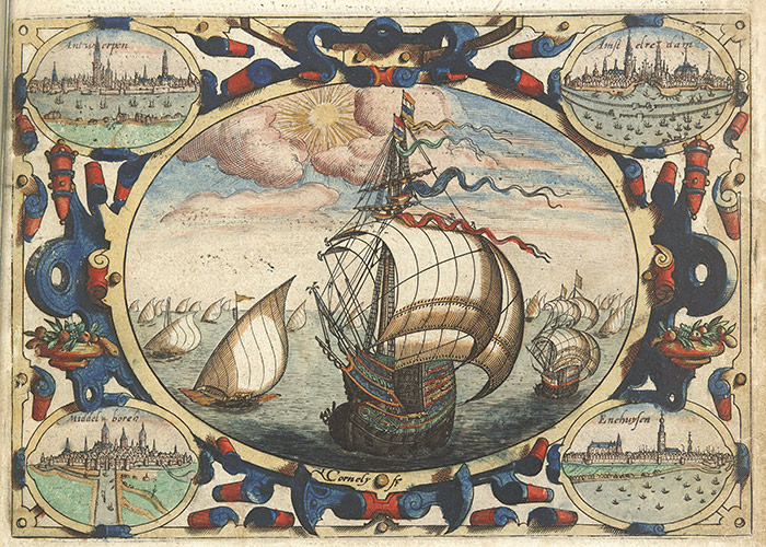 Detail from the title page of Itinerario, voyage ofte schipvaert, 1596, Jan Huygen van Linschoten. The Huntington Library, Art Collections, and Botanical Gardens.