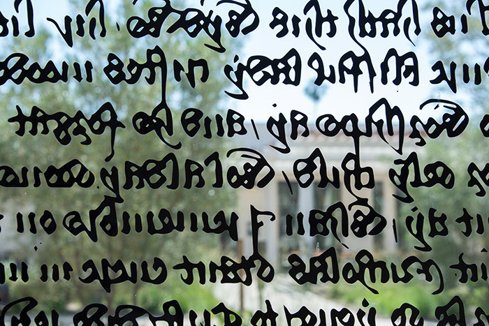 Chaucerian calligraphy lends its intricate forms to the front windows of the Mapel Orientation Gallery.